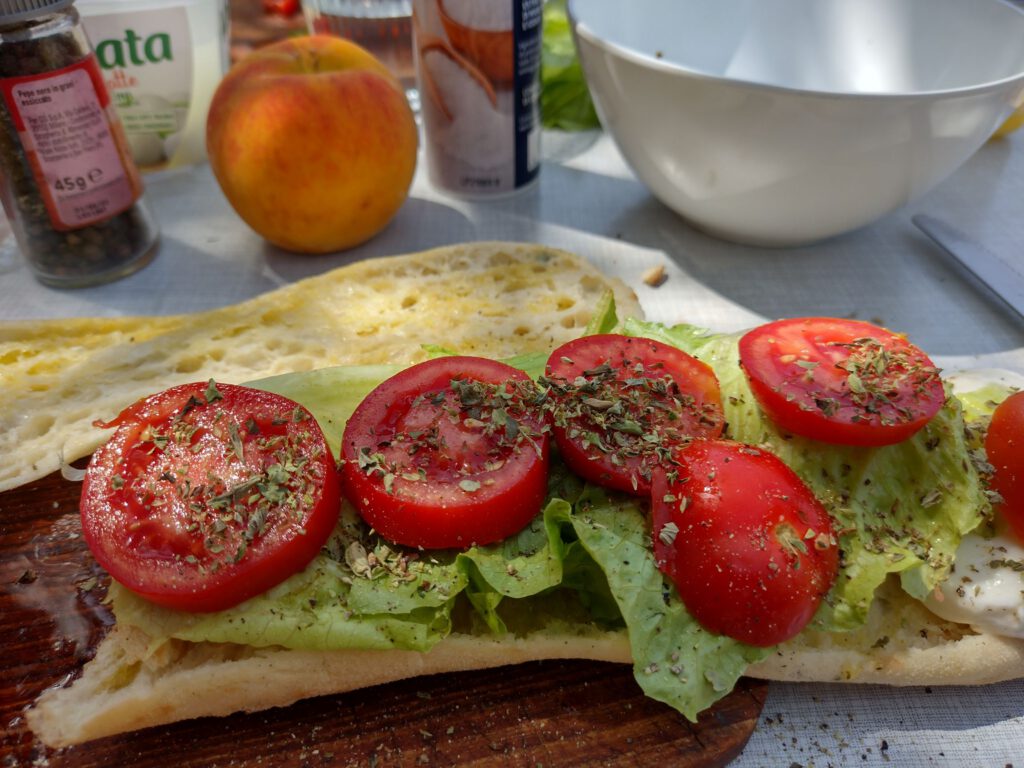 Diese Küche hätte schon längst einen Stern verdient: italienische Spaghetti al dente warten auf Parmesan, Gemüsevielerlei flirtet mit Landwein und Olivenöl, Rote Zwiebel an Salatblättern & Oregano-Tomaten