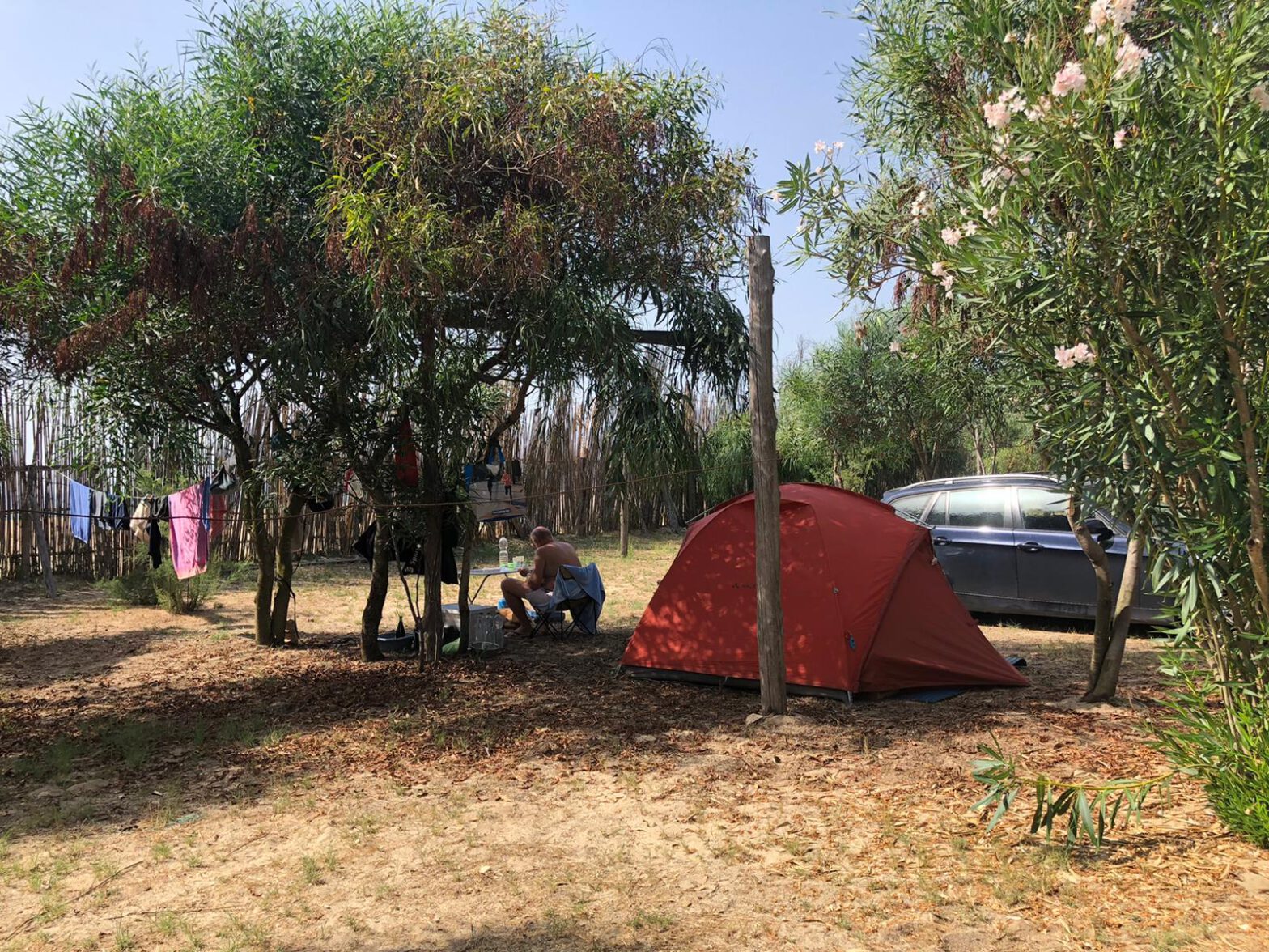 Schon das Begrüßungskomitee ist einzigartig: an mit blühenden Oleanderbüschen dicht gesäumter Straße stehen hinter dem Directione-Gebäude 3 Stühle am Staßenrand, besetzt mit 3 ItalienerInnen, sie repräsentieren kummuliert vielleicht so irgendwo zwischen 210 und 300 Jahren Lebenszeit. Er sitzt regungslos mit dem strengen Blick längst begonnener Demenz in seinem Stuhl, die beiden Damen, korpulent und freundlich, erwidern unsere Begrüßung lächelnd und winkend. Dieser Platz ist dem legendären Shangri La nicht unähnlich – ein idealer Ort der Ruhe und der Kontemplation, ein Platz, der auch etwas von einem in Vergessenheit geratenem Schloß hat: Wuchernde Vegetation, gerade noch funktionierende Ausstattung, die Camping Area ist seit Jahren verlassen bzw. fast leer: ein Wohnwagen mit sehr netten Italienern und ein Paar aus Jena mit unserem Reisekonzept (BMW und kleines Zelt) für eine Nacht – die kennen sich aus und sind nicht aus Zufall hier. Ein herrlicher, leerer Strand mit mit ein paar bereitgestellten Sonnenschirmen und Stühlen und einem spektakulären Sonnenuntergang.
